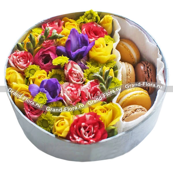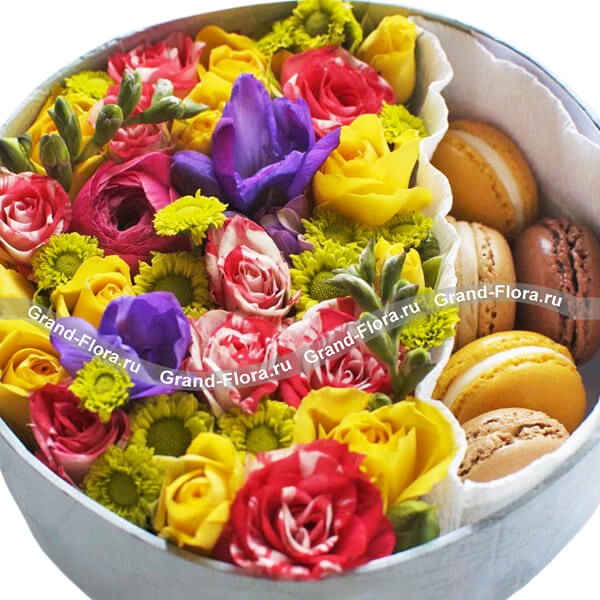 Стандартный (на фото): хризантема мелкоцветная желтая - 2 шт., фрезия фиолетовая - 2 шт., роза кустовая красная - 1 шт., роза кустовая желтая - 2 шт., рунункулюс красный - 1 шт., оазис, фетр белый, макарунс - 5 шт., коробка круглая (20х20см).